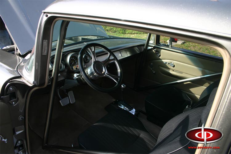 D&P also installed a built Turbo 400 transmission behind the nasty big block. The 57 was also back halved with a Chris Alston 4 bar rear suspension, fully tubbed and a Ford 9 inch differential with 4:10 gears was built and installed. A full roll cage was installed to reduce twist and provide a level of safety. D&P installed a March Performance pulley kit and a D&P aluminum cross flow radiator for cooling. Disc brakes and power steering with an Ididit Tilt column were also installed for comfort and safety as Gordon planned on mostly street driving for the beast. The body was painted in House of Kolor Galaxy Grey.