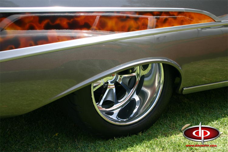 The inserts on the quarter panels were sprayed with “real fire” by the infamous VanDemon. The wheels were built by Budnik along with Mickey Thompson radials. The trim was replaced with all new parts from Danchuk. Gordon’s 57 was built to be a street car. The result is a scary fast hot rod. This thing goes from Zero to wet your pants in the blink of an eye. Originally the engine was set up for Nitrous but after some test driving it quickly became obvious that Nitrous would be over kill. I know, I know, you can’t have too much horsepower but this thing is a monster and plenty fast for a street car as is. Gordon’s 57 is loud, obnoxious, radical, and a handfull to drive. But it sure puts a smile on your face