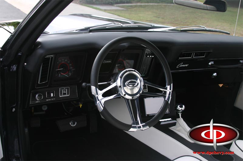 The original 10 bolt rear end was replaced with a 12 bolt differential with 3:73 gears and posi-traction. A Detroit Speed front subframe was selected to provide this first generation Camaro with the latest and greatest in handling characteristics. The front and rear of the Camaro were tied together with Global West sub-frame connectors and rear spring package.For stopping power a Baer brakes 6 piston 4 wheel disc brake system was installed. A March Performance engine pulley system was installed on the LS3. Comfort upgrades included Vintage Air Conditioning, Flaming River tilt column, Electric life power windows, and much more. A long list of restoration parts from Classic Industries was used for the restoration. A one off set of D&P 18 inch billet aluminum wheels were designed and built for Vernon’s Camaro.