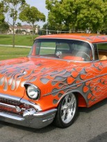 1957 Chevy Belair Hardtop Custom In Your Face! If you like a 57 Chevy and you like flames then you get it. This over the top Belair was custom built for the Hunt family of Southern California. This car lived most of it’s live in the San Joaquin Valley before finding it’s way to Huntington Beach to be given a new life by D&P. A complete frame-off restoration was performed which included all the new hardware you see. Upgrades included a brand new GM Performance 502 cubic inch...